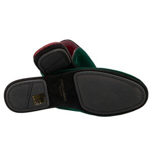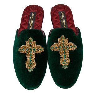 Velvet slipper shoes BRAMANTE with emerald color crystal gold cross in green by Dolce&Gabbana