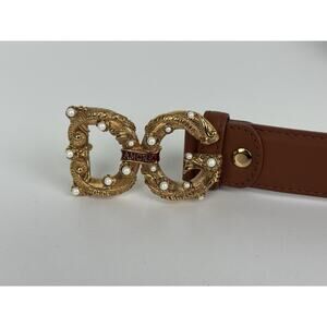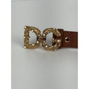 This Dolce & Gabbana DG Amore belt is crafted from deep brown leather and features a striking gold tone DG Amore buckle that adds a refined touch to any look. Made in Italy, the belt is in gently used condition with a few barely visible stains and light scratches along the strap, none of which detract from its overall elegance. The hardware remains in excellent condition, looking chic and polished. The belt measures 45 inches in total length and 1.25 inches in width, making it a versatile accessory for various outfits.