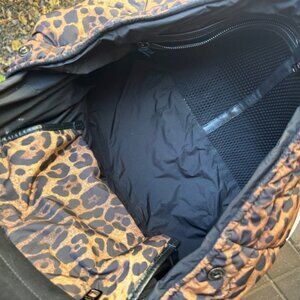 “The Sicily line, a signature of the brand, becomes this new spacious and practical travel bag. Modern and contemporary, it comes in quilted and padded nylon with the iconic leopard print. Designed to be carried as a handbag and crossbody bag, it is practical and bold.”