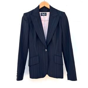 Chic and timeless D&G Dolce & Gabbana women’s blazer in charcoal black with elegant pink pinstripes and a silky blush satin lining. Crafted in Italy with structured tailoring and luxurious finishes, this Y2K blazer blends classic menswear styling with feminine detailing. Perfect for work, events, or elevated casual looks. Features notched lapels, sleek silhouette, and a flattering cut that transitions seamlessly from day to night. Authenticity guaranteed with inner hologram tag. A sophisticated piece from the discontinued 2000s D&G line—collector-worthy and ultra-stylish.