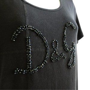 Dolce & Gabbana Designer Black Lux. Multi-faceted Beaded Large Front Logo. Back Macrame Yoke. Feels like a silk knit. Made in Italy. Measures Modern US Size Medium.