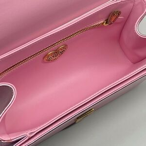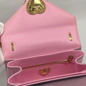 A bejeweled and bow-decked heart clasp with an antique-inspired finish lends a coquettish touch to a metallic-leather bag from the label's Devotion line.