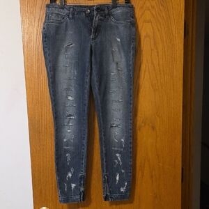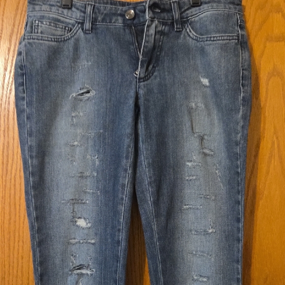 Chic distressed denim jeans. Perfect for casual outings. Comfortable fit with a trendy look.