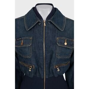 The jacket features a stylish fitted silhouette, a secure zip closure, and long sleeves, all accented with elegant gold-tone hardware. What sets this jacket apart is its detachable buttoned collar, offering versatile styling options to suit any occasion. It also includes practical pockets, blending functionality with Dolce & Gabbana's signature bold elegance.