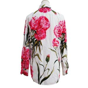 This gorgeous button-down blouse by Dolce & Gabbana is made of 100% cotton poplin and features a lush floral print in pink and green against a white background. The side seams have 8.25" vents up from the hem. The front of the wearer's left side is printed with the "Dolce & Gabbana" signature.