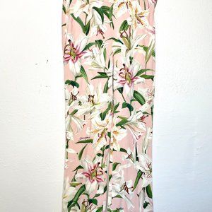 Beautiful floral crepe D&G kick flare trousers with a pink base and tropical white floral pattern. Features vibrant green leaves and white lilies. Close with a side zipper. They fit like a size 6.