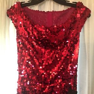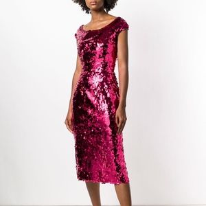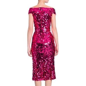 Listed is a fitted, sequin dress from the Dolce and Gabbana Autumn 2018 Collection. The MSRP is $3,495. It is size IT 38/UK6/US2. From a smoke free, pet free, and odor free home. This classic sheath dress is embellished with shimmering fuchsia sequins, making it the perfect combination of elegance and flair. The boat neckline is paired with off-the-shoulder sleeves, and the pencil style skirt is complete with a godet hem. There is a concealed zip in the back of the dress, which has a hook and loop closure.