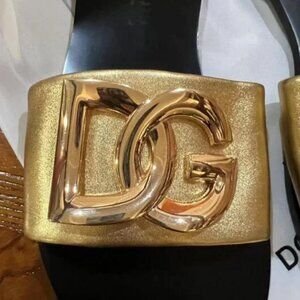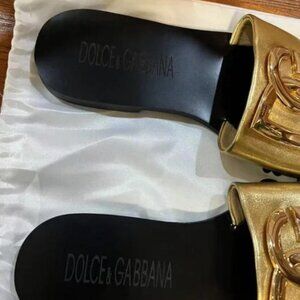 Elegant Dolce & Gabbana sandals. Features gold strap with iconic logo. Sleek black sole for contrast.