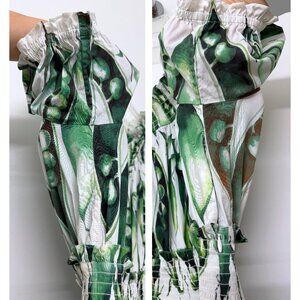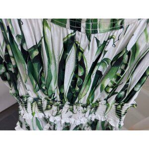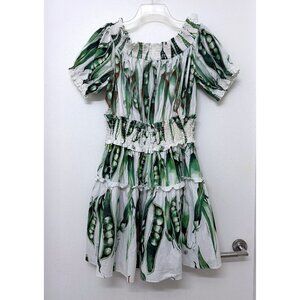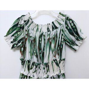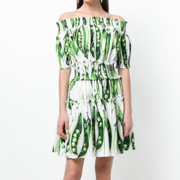 This Dolce & Gabbana Mini Dress is in good condition. Features a green beans / snap pea print on a white background (vegetable / veggie print). Cotton, short mini length, short sleeves / off the shoulder, smocked. There is some color fade on multiple areas, and there is a bit of color run on a small area on the skirt. Minor wear throughout.
