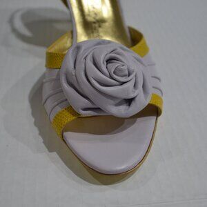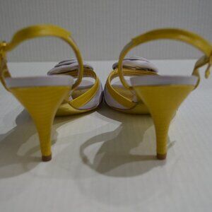 From famous maker Dolce & Gabbana comes this charming slingback in delightful colors of lavender and goldenrod. Made in Italy of 100% Italian leather, it shows off a delicate lavender leather rose at the vamp. The 3 inch heel is covered in goldenrod textured leather, as is the slingback strap and around the vamp and toe line. The insole and entire inside of the shoe is covered in gold, as is the bottom sole. The D & G logo is stamped on the insole and also on the bottom sole. The size is marked Italian 39, which is a size U.S. 9. New and never worn, the right shoe shows odd imprints on the bottom sole. This shoe is in pristine condition and arrives in its original box.