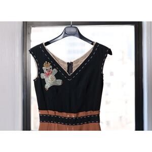 The dress is adorned with intricate embroidery featuring fairytale motifs such as a clock, teddy bear, and key. It boasts contrasting topstitching for a raw, artisanal effect, making it a truly unique addition to your wardrobe. Perfect for special occasions, pair this dress with elegant pumps for a sophisticated and whimsical look.