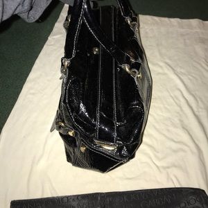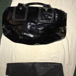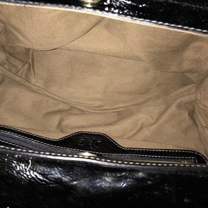 Crinkled Patent leather bag. Gold tone hardware. Belted exterior zip pocket. 6' straps. Zip pocket inside clean canvas lining. Side slip locks. Hidden Snap closure. Hang tag missing. Some edging wear on straps. Minor wear on exterior. Minor fading on some hardware. Overall good condition good & spacious. Dust bag included