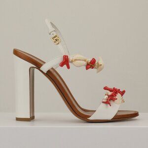 A true expression of Mediterranean elegance, the Dolce & Gabbana Keira Sandals capture the brand’s signature opulent craftsmanship. Expertly made in Italy, these sandals feature smooth leather straps adorned with intricate shell and coral embroidery, evoking the charm of seaside luxury. The sculptural high heel and gold-tone accents elevate the design, while the meticulous detailing reflects Dolce & Gabbana’s dedication to artisanal excellence. Perfect for summer soirées, vacations, or statement evening looks, these sandals bring a touch of coastal glamour to any ensemble.