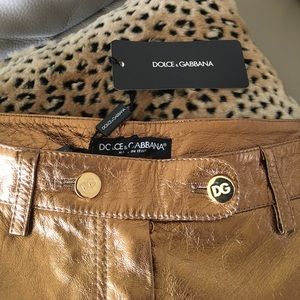 Authentic Dolce & Gabbana leather Bermuda cuffed shorts. These shorts are stunning. They make you look like a beautiful gold statue. The color is a beautiful bronze. 2 front pockets and 2 faux pockets on the back. Shorts are completely lined throughout with Dolce signature leopard print. Dolce runs small. These shorts SLAY!!!!