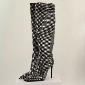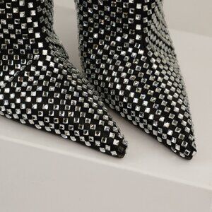 Glamorous and commanding, the Dolce & Gabbana Lollo Boots embody the house’s signature blend of opulence and Italian allure. Crafted in lustrous black satin, these boots are adorned with checkerboard-patterned crystal embellishments that shimmer with every step, adding a dramatic, show-stopping finish. The sleek pointed toe and sculpted high heel elongate the leg for a striking, ultra-feminine silhouette. A perfect statement piece for evening events or couture-inspired styling.