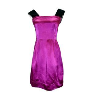 This elegant magenta purple satin sheath dress boasts a flattering square neckline, nipped waistline, wide pleats and wide black velvet straps. Minimal yet stunning!