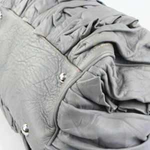 A cute yet practical addition to your closet, this Dolce and Gabbana bag has everything you need. Its leather exterior is designed with ruffles, giving the bag a feminine look. The gray color allows it to be matched with any outfit. It features silver-tone hardware to match the exterior, and has two round leather handles, a Dolce and Gabbana plaque and one shoulder strap. The interior is lined with beige alcantara and has a magnet