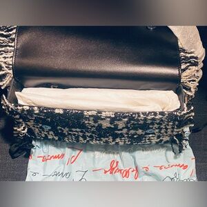Stylish tweed clutch with bold black and white pattern. Features sleek intertwined chain strap with leather section for shoulder and iconic logo detail.