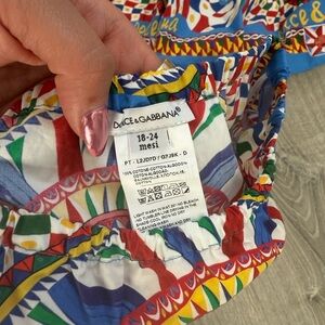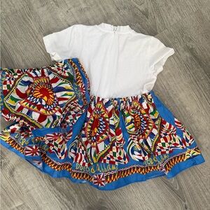 Charming baby dress set with vibrant patterns. Includes a white top and multicolor skirt. Ideal for a fashionable appearance.