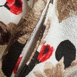 Chic blazer with bold floral design. Features red, brown, and black on a white background. Ideal for fashionable events.