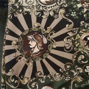 Regal motif with roman soldier, ornate scroll pattern, abstract doves and graceful flowers throughout.