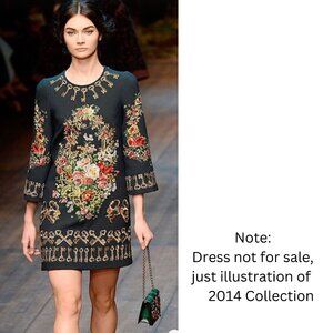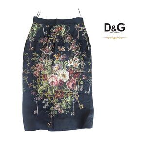 A rare and hard-to-find piece from Dolce & Gabbana's Fall-Winter 2014 "Noir Tale" collection, this black viscose pencil skirt is the epitome of sophistication. It is adorned with an intricate floral and antique keys design, it blends romance with mystery. The sleek, form-fitting silhouette enhances elegance, making it a timeless statement piece for collectors and fashion lovers alike. Used, In very good condition.