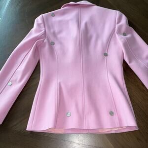 Vintage D&G Dolce & Gabbana pink wool jacket with leather trim straps. Buckle & snap closed