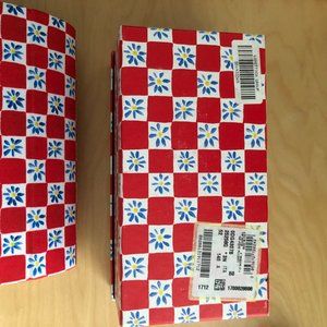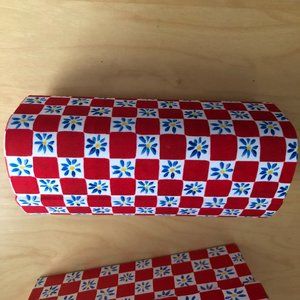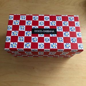 Stylish Dolce & Gabbana glasses case. Red and white checkered pattern. Floral accents add charm.