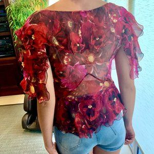 Beautiful multicolored floral chiffon blouse made by luxury designer Dolce & Gabbana, detailed with gorgeous ruffles and side zipper (pictured)