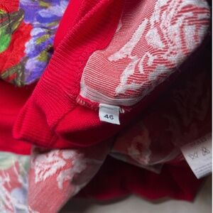 Gorgeous textured crepe print in front with red knit sleeves and back