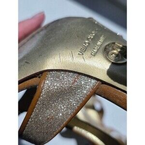 Slight wear, please review all photos for details. The leather straps are in good condition, and the heels are excellent. Minor scuffs on the glitter, but in locations that're harder to see. The leather accents are a olive-brown color but all you really see is the sparkle.