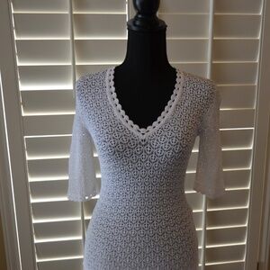 White Color. Short Sleeves. V-Neckline. Sheer Stretch Lace Material. Italy Size 44 equivalent to US Size 8. Runs small note the measurements in photos. Dry Clean Only. No Flaws or Stains.
