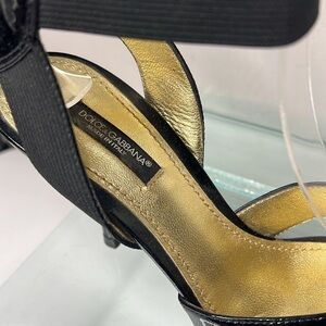 This is a beautiful pair of Dolce & Gabbana Sz 36 Patent Leather Elastic Peep Toe Heels Sandals. 3.5” patent wrapped heel. Elastic ankle strap for easy in and about and super comfortable. Lightly padded goldtone leather interior. Excellent pre owned condition. No tears. No odors. Made in Italy