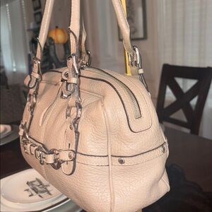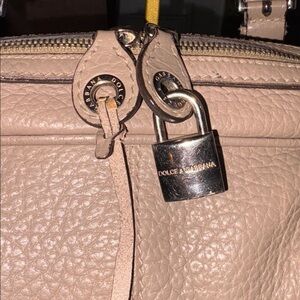 Chic tan leather handbag by Dolce & Gabbana. Features a distinctive silver lock detail.