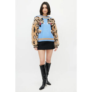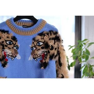 Dolce & Gabbana blue and brown sweater featuring crew neckline, fuzzy sleeves with leopard pattern, two tiger heads intarsia at chest, and ribbed hem and cuffs.