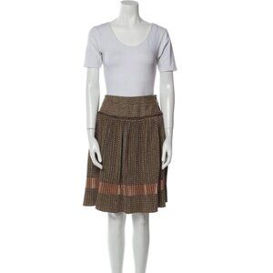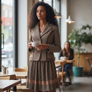 Tailored Dolce & Gabbana two‑piece suit in a warm tweed blend, offering timeless sophistication. The jacket features a fitted silhouette, notch lapels, darts through the waist, and structured shoulders. The matching skirt is classic knee-length with a subtle pleating detail and clean lines. Together, it’s a versatile set that works in boardrooms or elevated brunch settings.