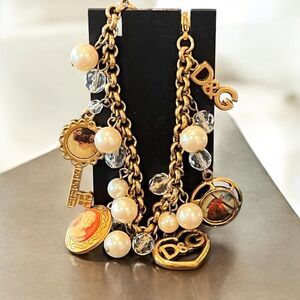 This stunning D&G bracelet features a luxurious combination of gold-toned metal and pearl-like beads, exuding a timeless baroque-inspired elegance. The intricate link designs and medallion elements create a sophisticated statement piece, perfect for elevating any ensemble.