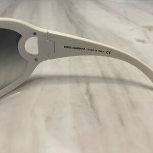 Stylish Dolce & Gabbana sunglasses. White frame with black lenses. Elegant design with logo detail.