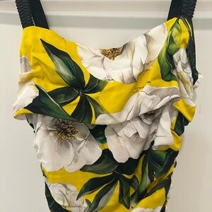Vibrant yellow mini dress with bold floral print. Features black straps. Perfect for summer outings.