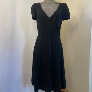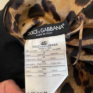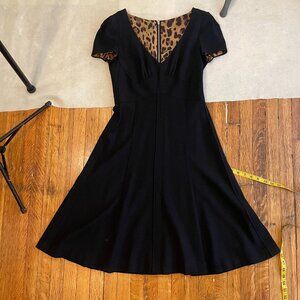 This little black Dolce & Gabbana dress is incredibly flattering. Low-high bodice with v-neck, tulip-like short sleeves and a full a-line skirt that sways and swirls beautifully when you walk. Back zipper w/hook and eye; leopard print lined. Wool blend. Amazing raised seam details across the dress -- shoulders, sleeves, bodice and skirt. There is one small hole in the fabric at the bottom right near the hem. See close-up photos for details; price reflects this flaw, which is hard to see when the dress is on. Italian size 46 -- so roughly a U.S. 8-10, but please refer to photos and flat sizing. Amazing dress with fantastic details sure to turn heads!