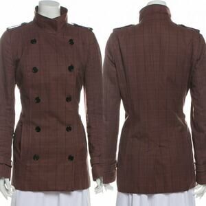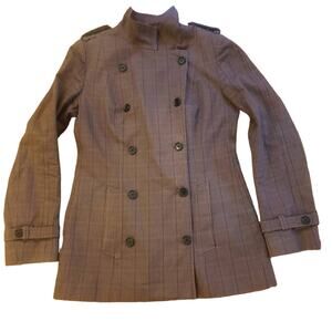 Brown plaid trench coat with high collar. Has polyester filling which adds additional warmth. Insignia buttons. Size IT 44 or US 8. Approx bust 36" length 29"