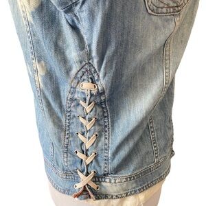 This is an amazing everyday vintage jean jacket made by Dolce & Gabbana. Super cute and great for any occasion, has bleach splatter pattern to it with decorative lacing on the sides. Has 2 chest pockets. A size 40 IT is a US 4. In excellent pre-loved condition, Comes from a smoke free home
