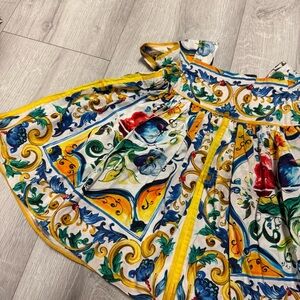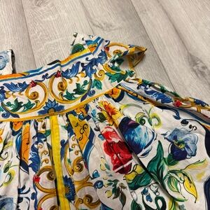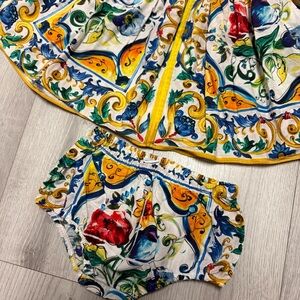 Vibrant kids dress set by Dolce & Gabbana. Features a colorful floral and scroll pattern. Includes matching bloomers.