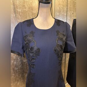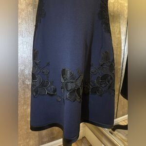 Elegant navy dress featuring intricate black floral embroidery. Perfect for special occasions. Excellent condition, worn once, fabric and size tag missed, check measurements