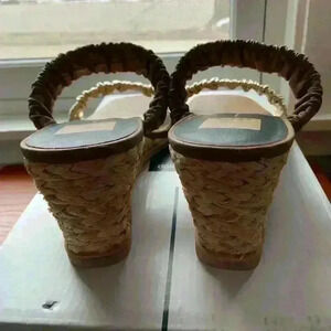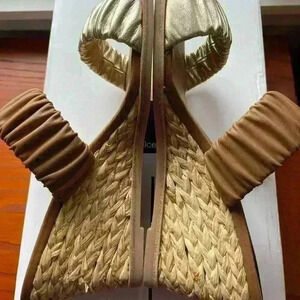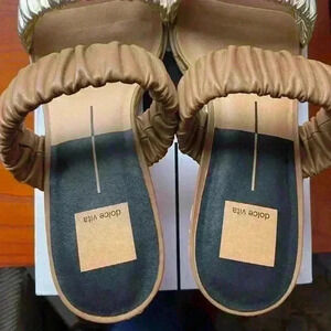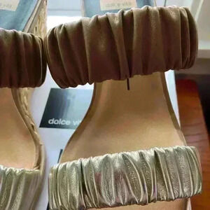 The chic and sassy dolce Vida sandals are perfect for a statement look. A silver metallic strap, and a tan colored strap on a wedge soul make this pair of summer shoes versatile.