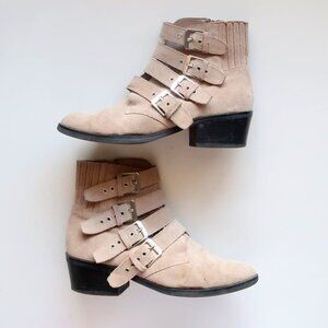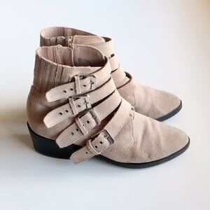Gorgeous Dolce Vita ankle boots crafted from genuine beige suede leather. Multiple buckle strap accents add a polished touch to the Western-inspired profile of this beautiful bootie that's gently lifted by a solid stacked block heel. Inside zip closure for easy on and off. Hidden elastic inserts at the back for that perfect fit. Great fall boots to wear with cropped jeans or midi dresses.