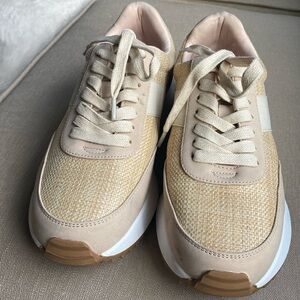 Elevate your sneaker game with these designer/athletic DV DOLCE VITA "Bettie" women's jogger fashion sneakers with tweed uppers, in a natural, 2-tone beige color. Perfect for women who value both fashion and function, these platform style jogger sneakers feature a standard lace closure for a secure fit. These Dolce Vita women's sneakers come in size 8 1/2