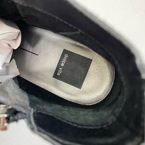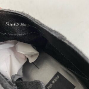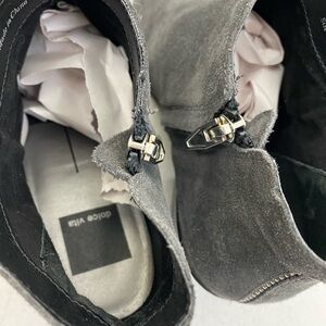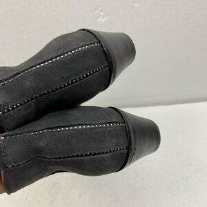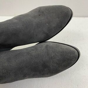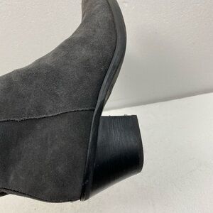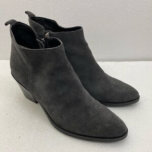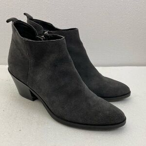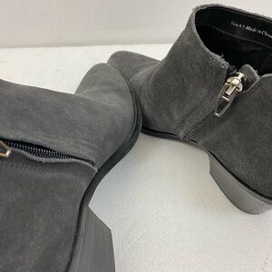 Sleek gray ankle boots. Suede finish. Low block heel. Side zipper closure.
