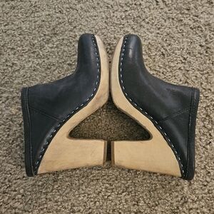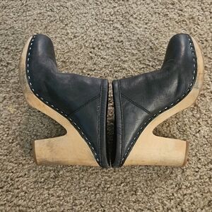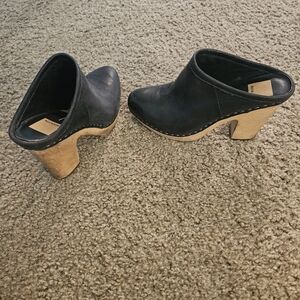 Stylish black leather clogs featuring a unique wooden heel. They were bought at Anthropologie. They do have scuff marks on the heels, see photos. 4 inch heels. Perfect for a chic and retro look.