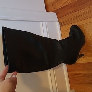 Dolce Vita luxe, luscious, black leather knee hi boots, wider calf style boot, round toe. Needs heel tips asap, but SO much life left. Comfortable! 3 1/2 in heel but slight platform makes these very easy to walk and live in for hours!